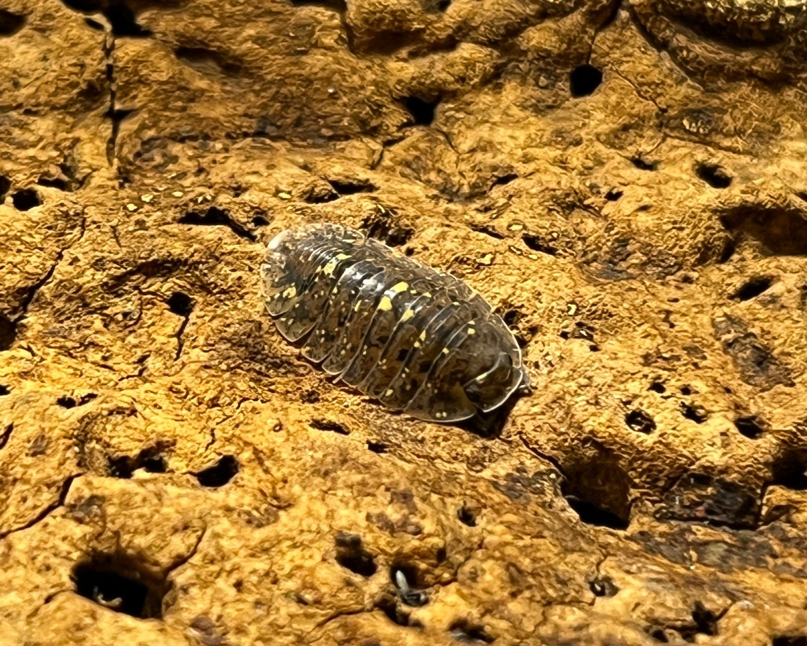 Mit ihrer breiten Erscheinungsform und den goldenen Sprenklern, die bei jeder Assel individuell angeordnet sind ein echter Hingucker. Im richtigen Licht scheinen die Merulana translucida durch die goldenen Punkte fast zu funkeln. Ein weiteres Merkmal dieser Art ist ihr in der Mitte eingekerbtes Mundschild.